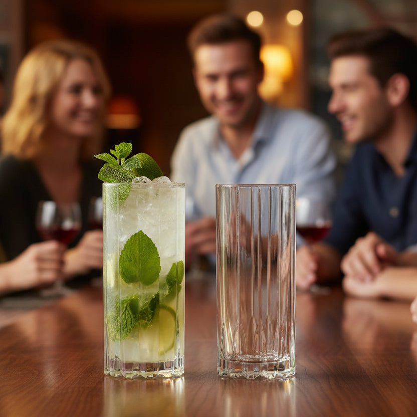 The plastic straw ban changed something more fundamental than most hospitality operations initially anticipated. Removing the straw from a long cocktail is not simply a swap: in a glass not designed for straw-free drinking, it creates a functional problem. Standard tall tumblers, whether a generic Highball glass or a Collins glass borrowed from another use, are typically not calibrated to allow comfortable drinking without a straw. Ice shifts toward the lip when the glass is tilted, garnish slides forward, and the drink becomes ungainly rather than elegant. The paper straw exists as a workaround for a glass design problem rather than as a genuine solution.