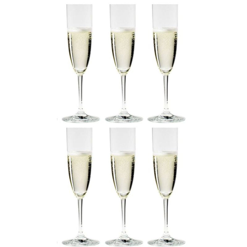 Quick Overview: Riedel Vinum Champagne glasses in sets of 2, 4, 6, or 8, each with 160ml capacity. Sleek flute design with etched sparkling point creates continuous bubble streams, perfect for light, fresh champagnes and sparkling wines.